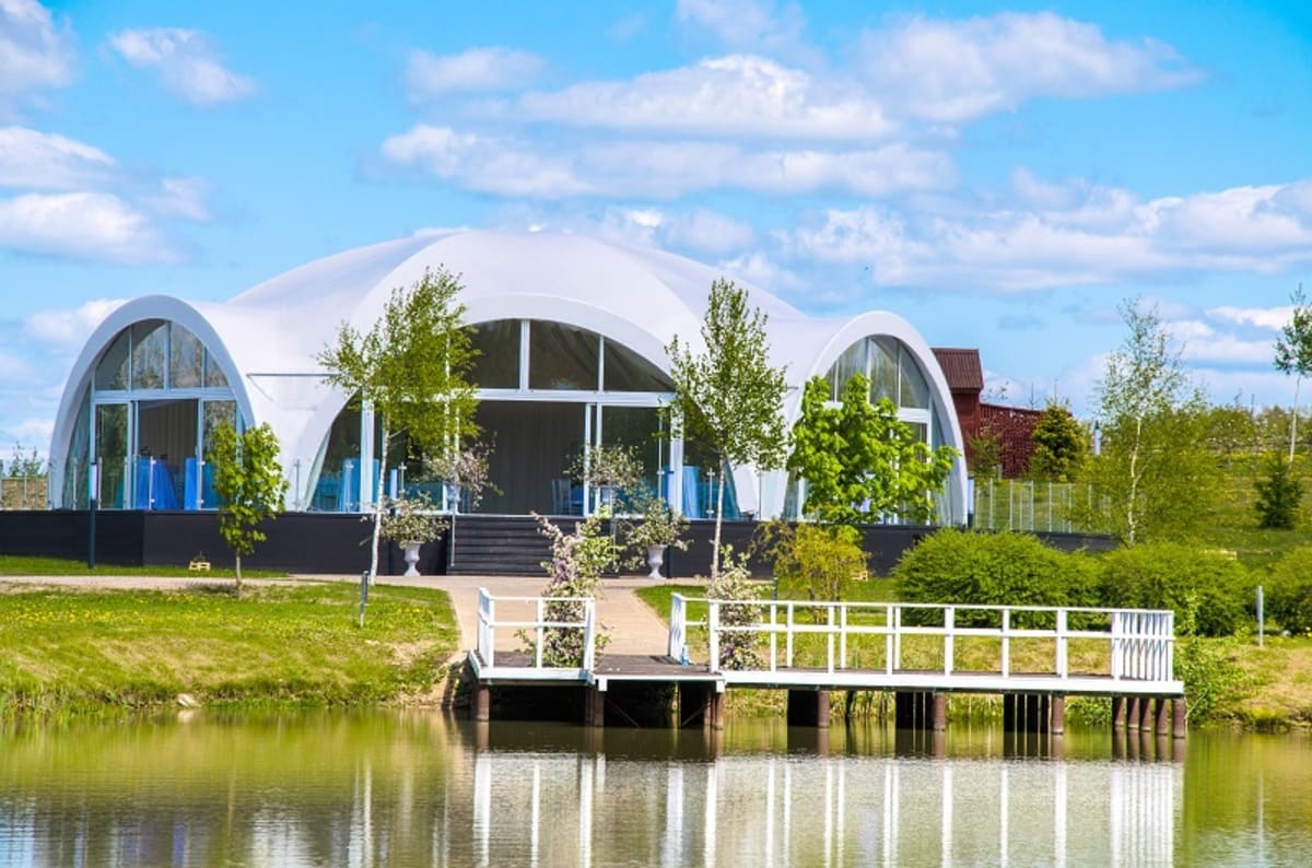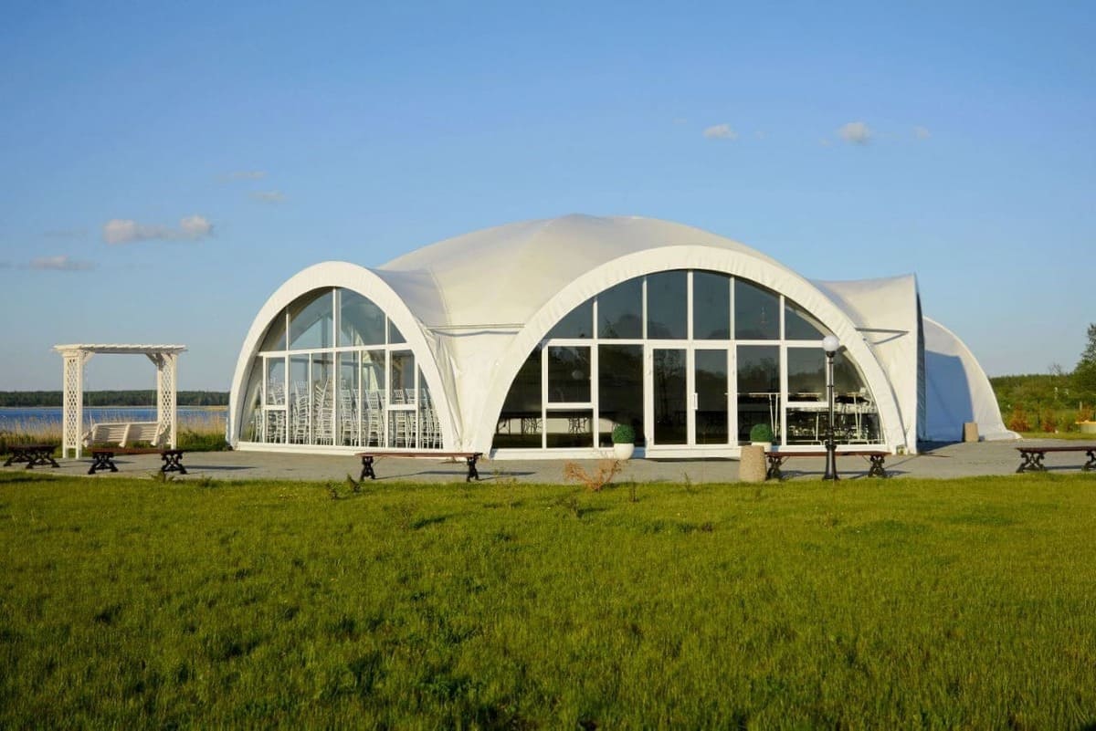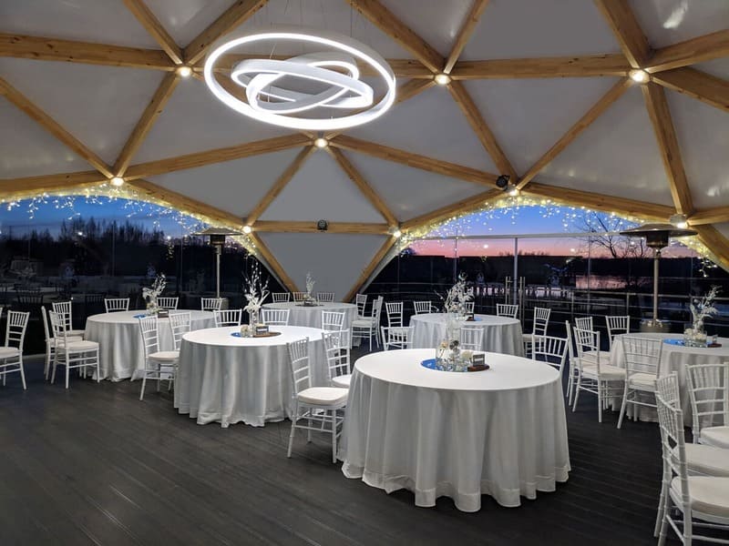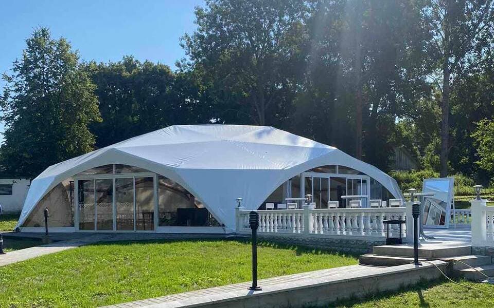 Длина/ширина: 10/10мПлощадь: 100м2Вес: 1000кгВместимость: банкет-70 чел/фуршет-90 челВысота входа/высота в коньке: 4,5м/3,2мКаркас/купол: сталь/негорючий ПВХ-тентСтены: полумесяц/сплошная/раздвижнаяВремя монтажа/демонтажа: 4 часа/3 часНагрузки снеговые/ветровые: до 5см/до 20м/сВозможность стыкования: да, 10х10