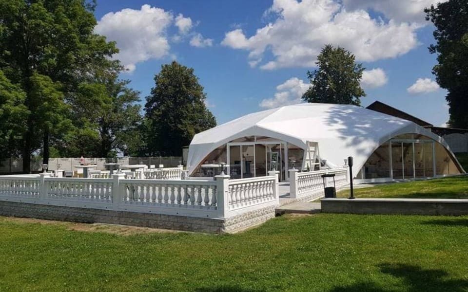 Если вас интересуют шатры для проведения свадьбы, вы на правильном пути! Только на страницах нашего каталога вы найдёте шатёр размером 20 на 20 метров, который идеально подходит для торжества на 70-100 гостей. Конструкция выполнена из прочного металла, который не подвержен воздействию влаги и сильных порывов ветра. Непосредственно тентовая ткань также не пропускает влагу и надёжно защищает от ненастья.