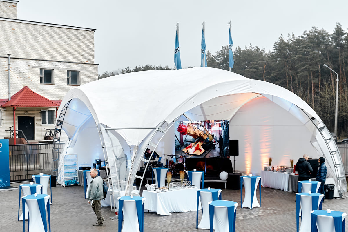 Монтаж шатра занимает всего 6 часов, демонтаж — около 3 часов, что позволяет быстро подготовить площадку к событию. Возможность стыковки модулей 10×10 м даёт простор для масштабирования и нестандартных конфигураций.